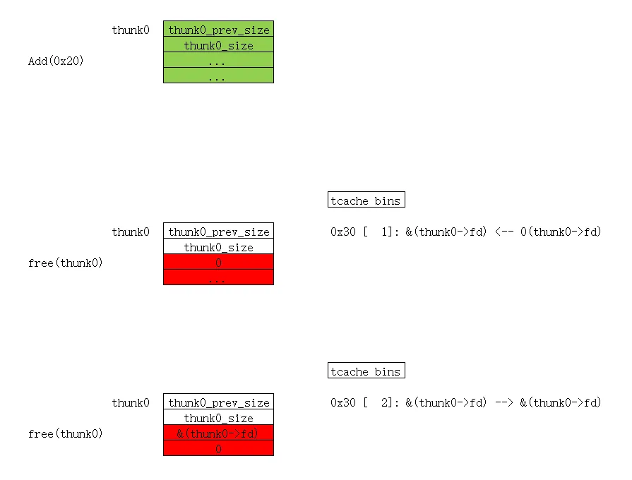 free(&(chunk->fd))(dup)得到的是chunk->fd = &(thunck0->fd),也就是当前tcache bins的头链